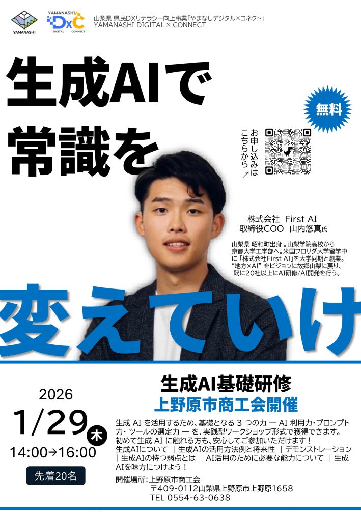 上野原市商工会では、生成AIをもっと身近に、そして安心して使えるようになる無料セミナーを開催します。生成AIの基本的な考え方から、仕事や日常で役立つ活用方法までを、実践を交えながらわかりやすく学べる内容です。AI活用力・ツール選定力といった大切なポイントを、ワークショップ形式で体験的に習得できます。生成AIが初めての方でも無理なく参加できる構成ですので、「興味はあるけれど難しそう」と感じている方もぜひご参加ください。AIを上手に取り入れ、業務の効率化や新しい発想につなげてみませんか。